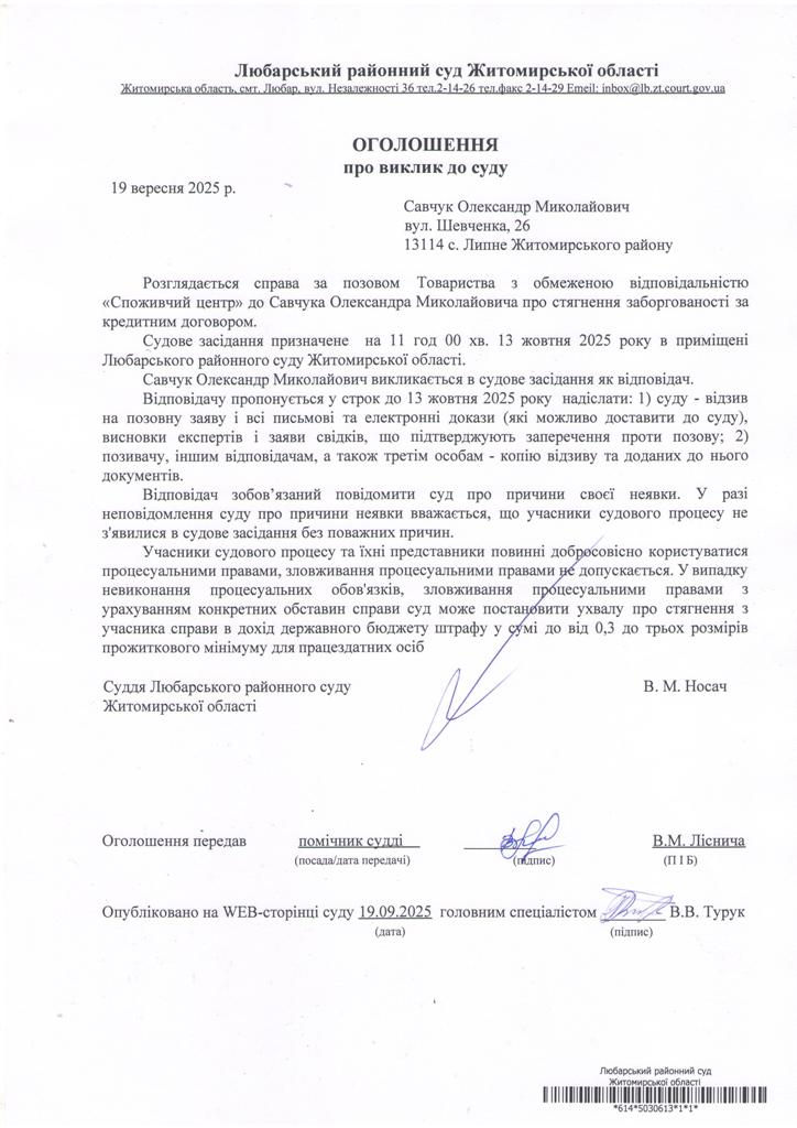 Оголошення про виклик до суду Савчука Олександра Миколайовича
