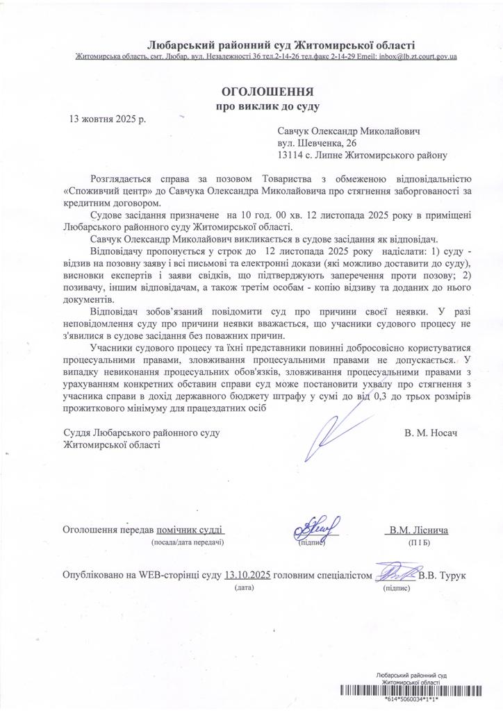 Оголошення про виклик до суду Савчука Олександра Миколайовича