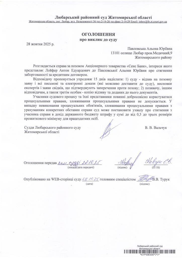 Оголошення про виклик до суду Павловської Альони Юріївни