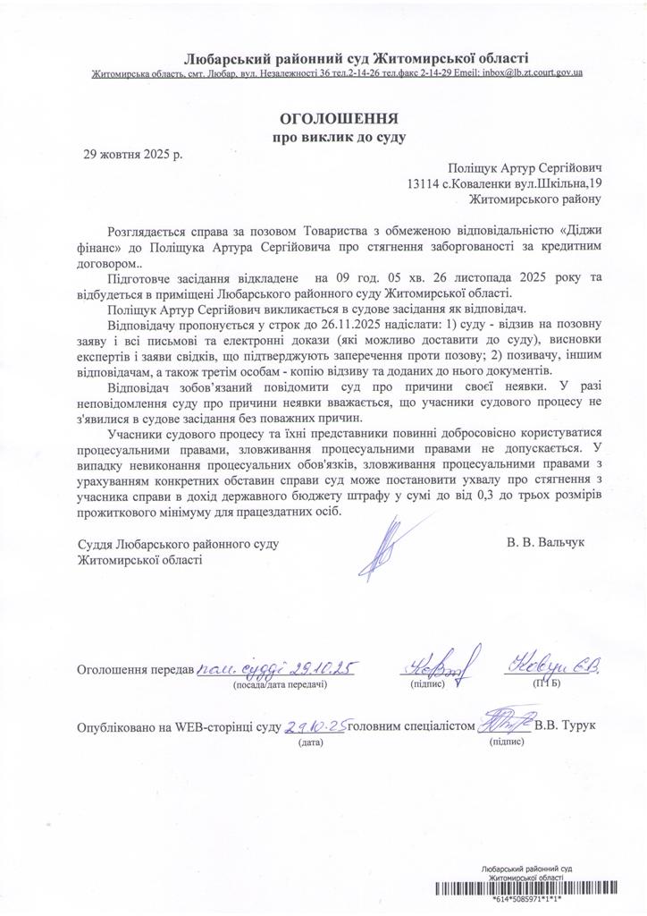 Оголошення про виклик до суду Поліщука Артура Сергійовича